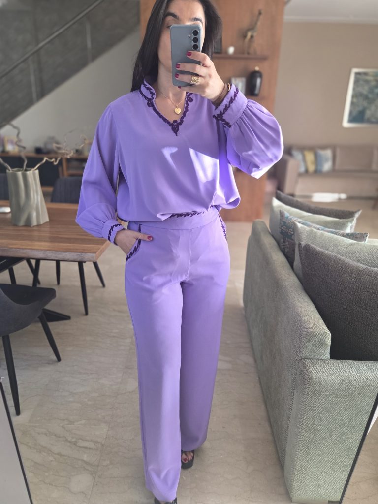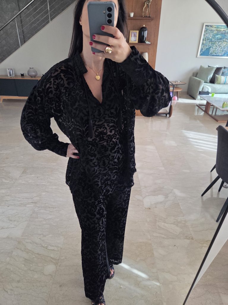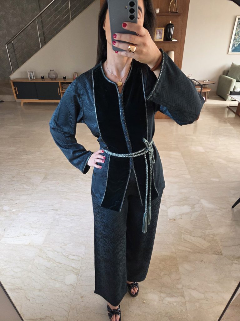 Ensemble 3 pièces pantalon et jabador en velours et tunique en crêpe de soie