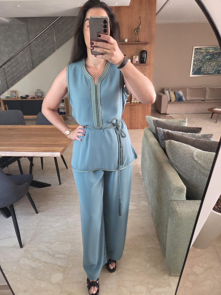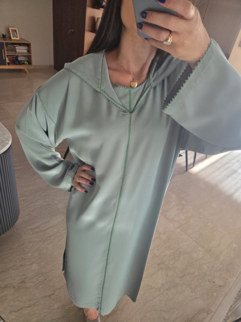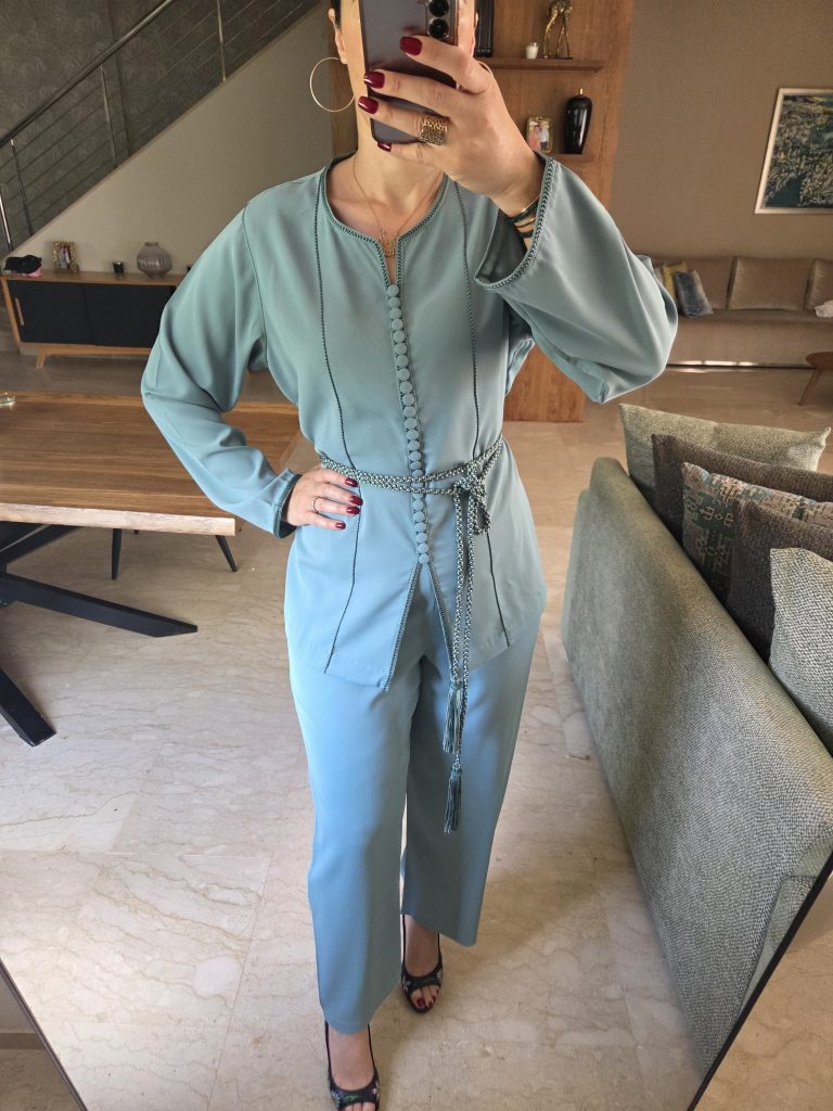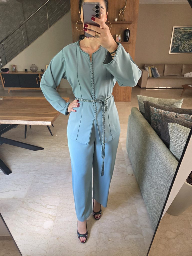 Jellaba 2 pièces 100% handmade – crêpe de soie & mousseline vert eau