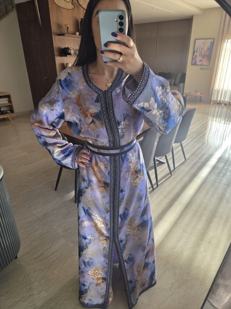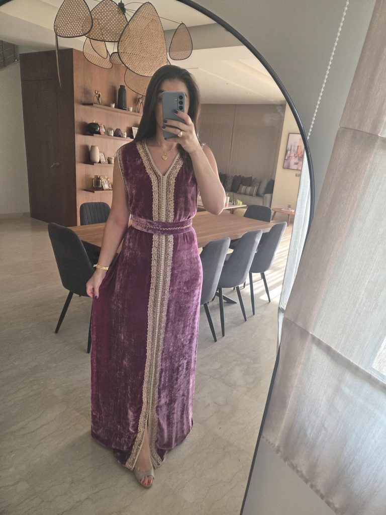 Jellaba matchy matchy en crêpe de soie et khrat en velours
