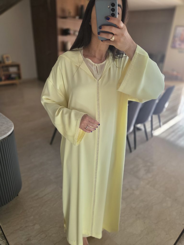 Jellaba 2 pièces 100% handmade – crêpe de soie & mousseline jaune beurre