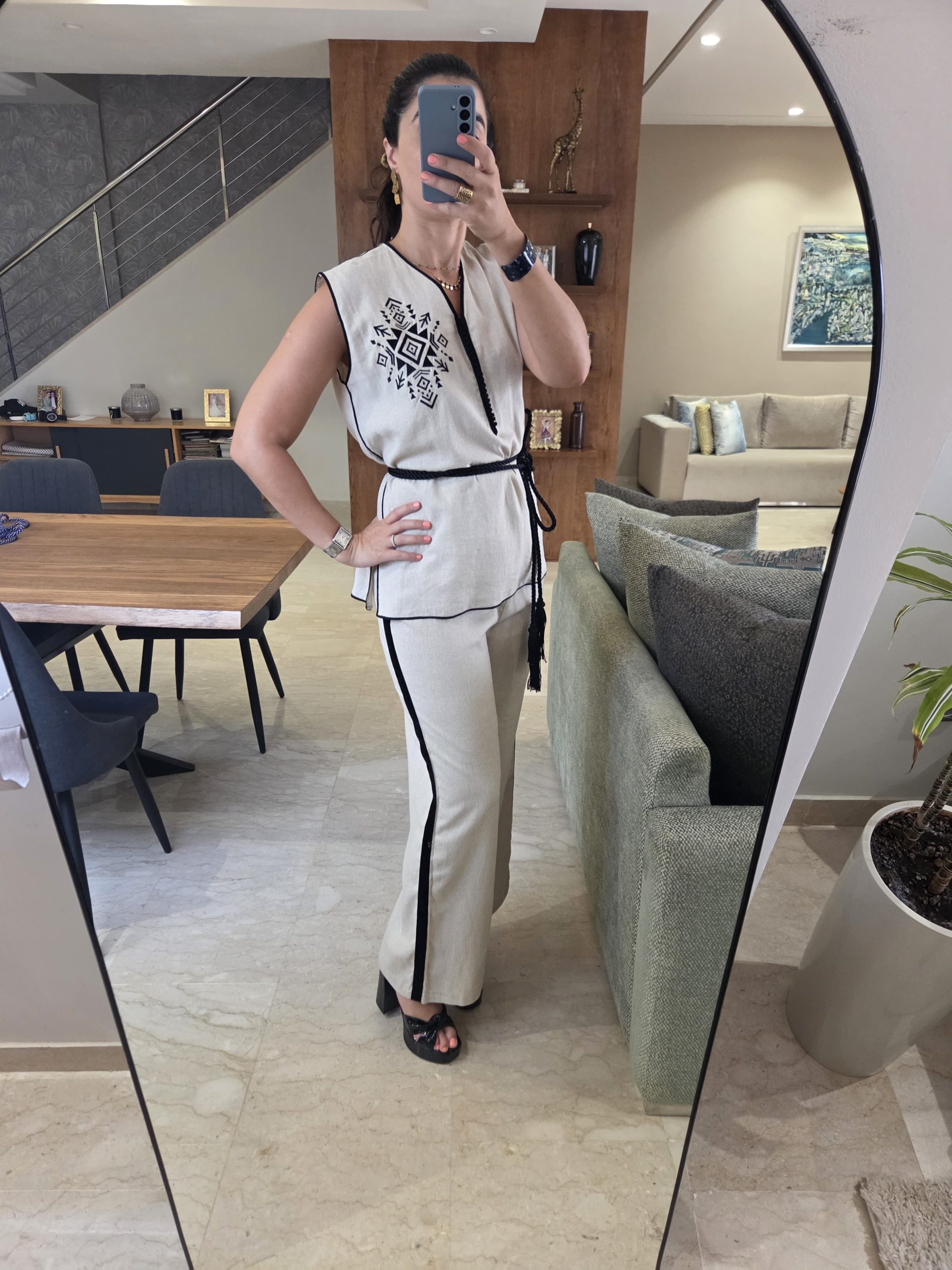 Couleur : Beige et noir Tissu : Lin Détails : Travaillé avec broderie noire et bande en velours noir sur le pantalon Taille : Standard Disponibilité : Taille standard