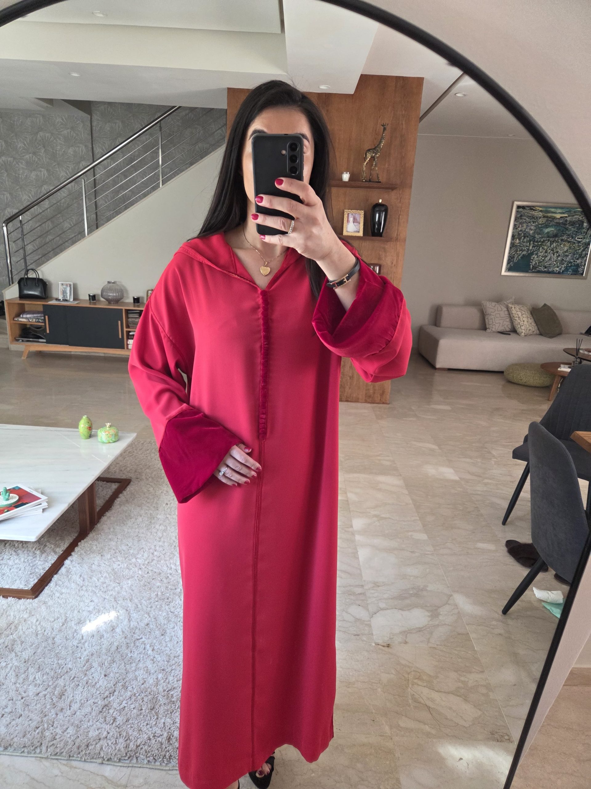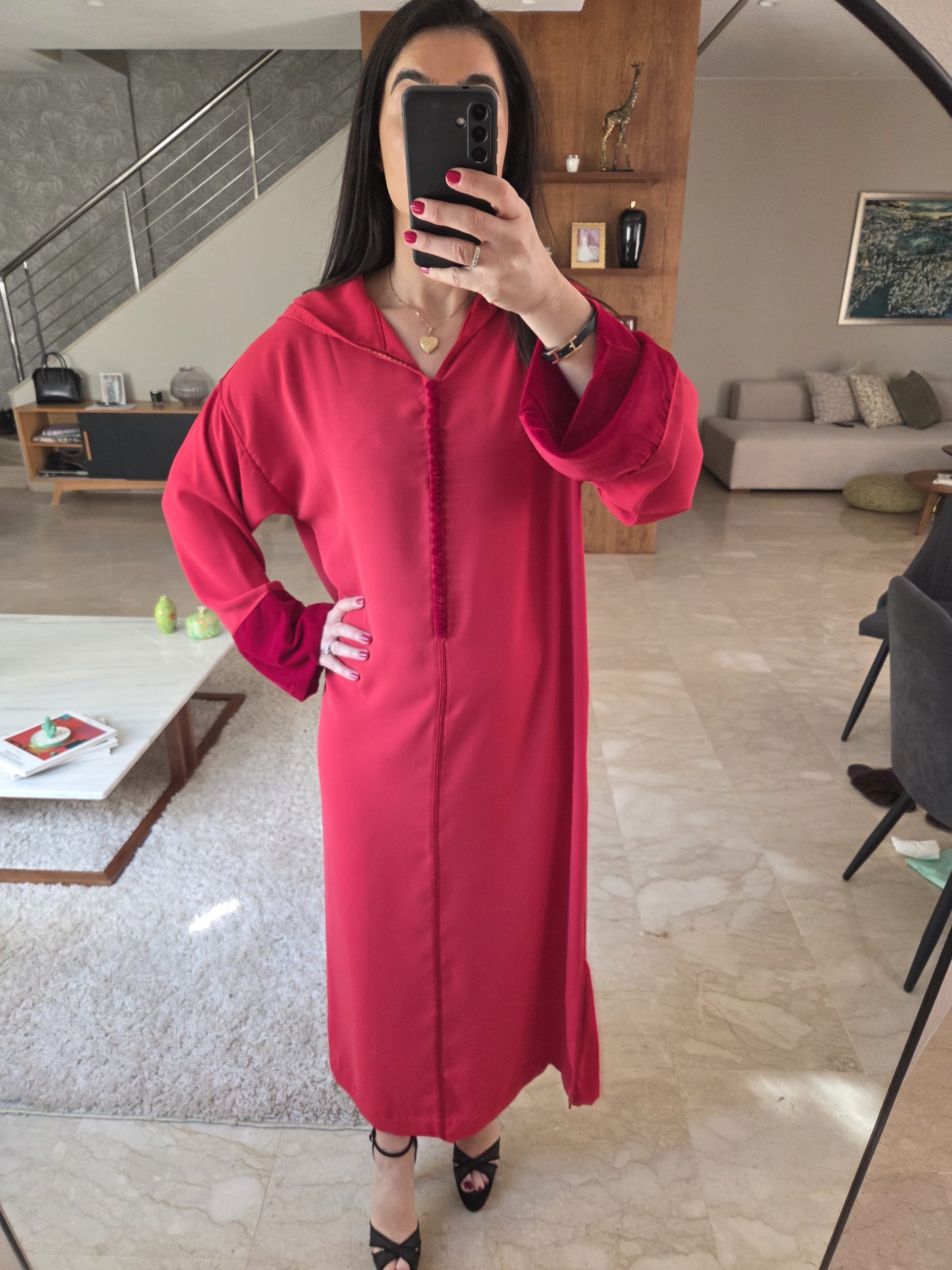 Nom du produit : Jellaba rouge en crêpe de soie et manches en velours Prix : 800 MAD Taille S /M